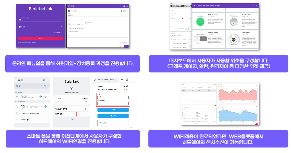 - 장소등록-장치등록-대시보드생성 대분류 3단계를 통한 간편한 하드웨어 IoT 연동 및 소프트웨어 구성이 가능합니다.